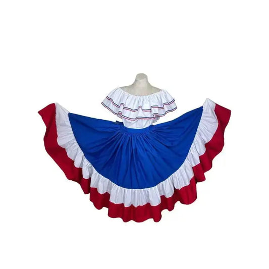 Embrace the vibrant spirit of Caribbean culture with our stunning Caribbean Dancing Wide Dress, featuring elements from the Dominican Republic and Puerto Rico. This beautiful ensemble is perfect for celebrating tradition and elegance during festive occasions. Complete Set: Comes with a matching blouse and skirt, plus a striking red flower headpiece (headcomb) for an authentic and coordinated look. Variety of Sizes: Available in sizes XS to XXL, ensuring a flattering fit for all body types. (Refer to the Size Chart in the Photo Gallery for guidance.) Elegant Length: The skirt measures approximately 36 inches, designed for both grace and comfort, allowing easy movement. Vibrant Colors: Features a stunning palette of white, red, and blue, beautifully representing Caribbean heritage and tradition. Quality Material: Made from high-quality heavy-duty polyester, offering durability and breathability for comfortable all-day wear. Easy Care: Effortless maintenance; this dress can be machine washed, hand-washed, or dry-cleaned to keep it looking its best. Transform every moment into a memorable celebration with our Traditional Dress. Carefully tailored, this piece not only enhances your look but also showcases your rich Caribbean roots and pride, making it an ideal choice for representing Puerto Rico and the Dominican Republic through its vibrant flag colors. Check our collection: Puerto Rican Collection