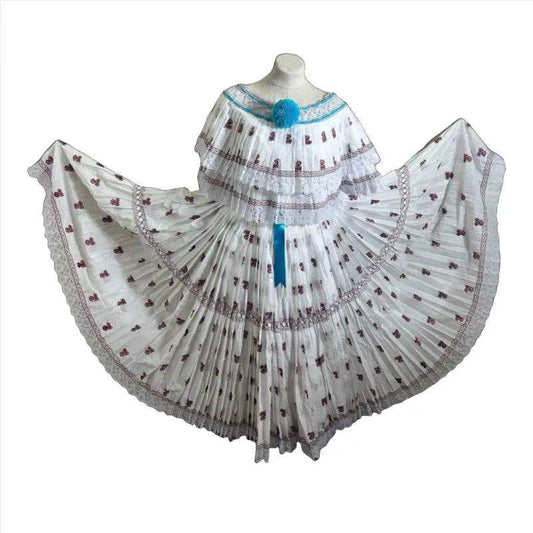 Immerse yourself in the rich cultural heritage of Panama with our exquisite Panamanian White Organza Pollera Dress adorned with vibrant turquoise pompoms. This beautiful dress is not just a garment; it's a celebration of Panama's vibrant culture and traditions, meticulously handcrafted by skilled artisans dedicated to preserving the essence of Panamanian crafts. What's Included: This stunning dress set includes a blouse and a skirt, beautifully accented with red pompoms and a petticoat for added volume and elegance. Available Sizes: Choose from M, L, and XL, with a length of approximately 36 inches to ensure a perfect fit for various body types. Color: Classic white, offering a timeless look that can be styled for various occasions. Material: Crafted from high-quality PolyCotton, providing comfort and durability while maintaining a lightweight feel. Care Instructions: To preserve the integrity of the fabric and embellishments, we recommend hand-washing or dry-cleaning. Special Features: Each dress is a testament to the hard work of local artisans, making it a unique piece that carries the story of Panama’s rich traditions into modern celebrations. Celebrate your special occasions with the elegance and tradition of Panama. Whether you're attending a cultural festival, a wedding, or any festive gathering, this dress is designed to help you stand out while embracing the essence of Panamanian heritage. Order now and join in the vibrant culture that is beautifully woven into each stitch of this exquisite dress.