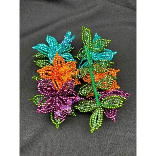 Introducing the exquisite Pair of Colorful Pearl Tembleques, a vibrant and elegant addition to your traditional attire. These beautiful accessories are perfect for enhancing your folkloric dresses and showcase the rich culture of Panama. Traditional Design: Features three flower designs, expertly handmade to reflect the essence of Panamanian culture. Material Quality: Crafted using colorful pearls and iridescent beads (tornasol) for a stunning visual appeal. Perfect for Folkloric Dresses: Ideal for pairing with 'la pollera', the beautiful traditional dress of Panama, enhancing your overall look. Versatile Usage: Suitable for special occasions, festivals, or everyday wear, allowing you to celebrate your heritage. Comfortable Fit: Designed to easily adorn the hair buns of empolleradas, ensuring both style and comfort. Unique Gift Idea: A thoughtful gift for friends and family who appreciate cultural accessories and craftsmanship. Each pair of tembleques is identical, ensuring that you achieve a balanced and harmonious look. Embrace the beauty of Panamanian culture with these stunning colorful pearl tembleques, and let your style speak volumes.