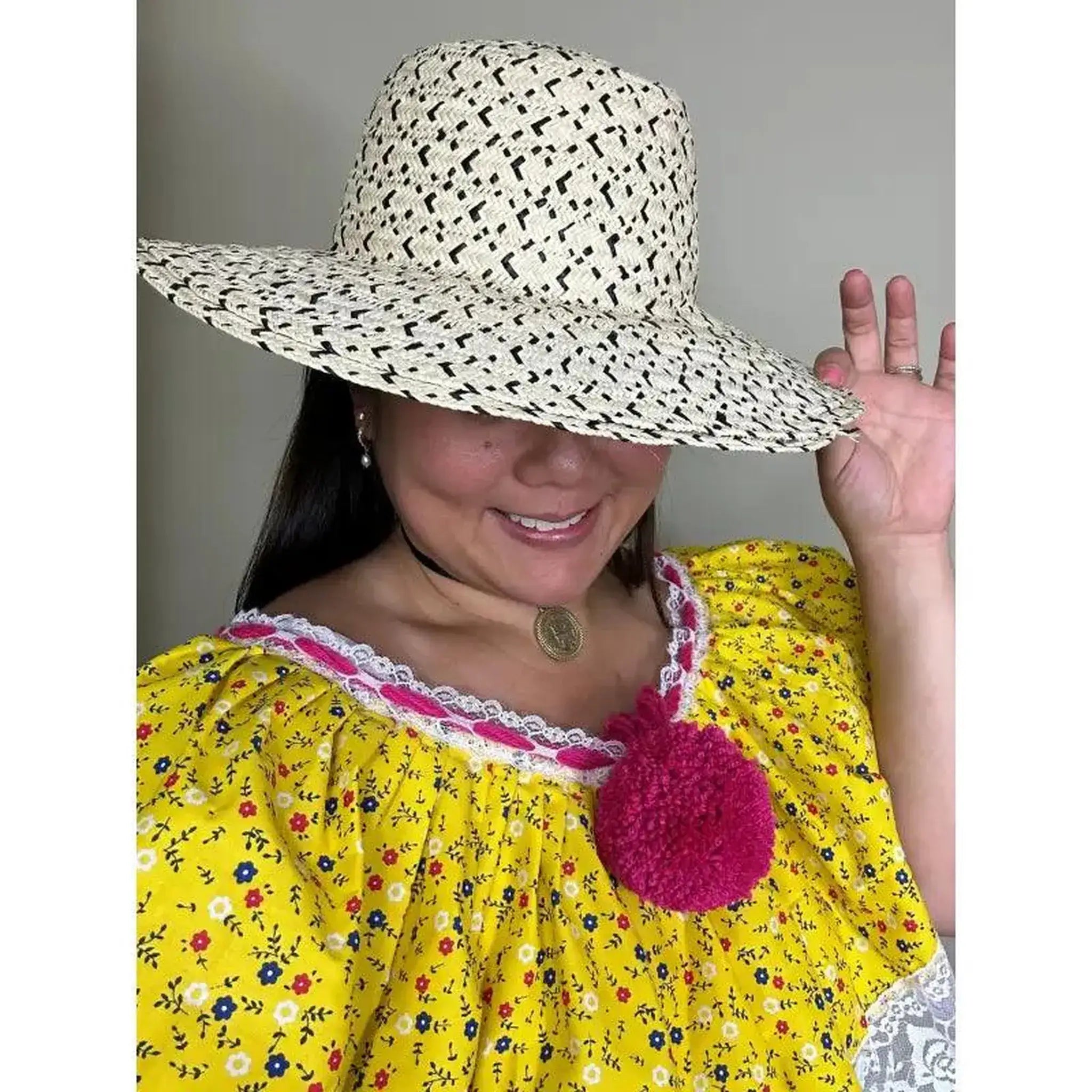 Blusa campesina con hombros descubiertos y estampado elegante panameño con pompón