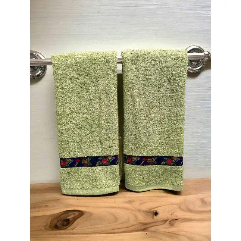 Ces serviettes sont 100 % coton très absorbantes. La décoration est réalisée en ruban jacquard panaméen authentique.