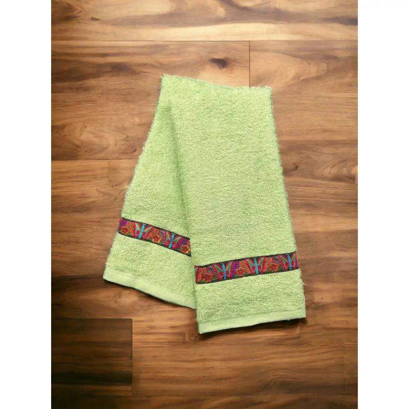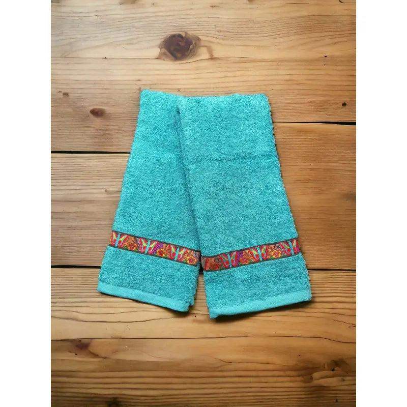 Apportez les couleurs du Panama dans votre maison avec cet ensemble de deux (2) serviettes à main décorées d'un authentique ruban jacquard panaméen présentant des motifs de style mola, tels que des oiseaux, des fleurs ou des papillons.